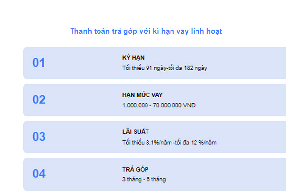 Kỳ hạn hỗ trợ tối thiểu 91 và tối đa 182 ngày (thực tế từ 7 đến 10 ngày) phát sinh lãi suất từ 8.1% – 12%/năm. Hệ thống không tính phí liên quan, khách hàng chỉ cần trả số tiền lãi theo thoả thuận.
